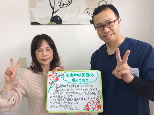 頭痛、めまい、腰痛、肩凝り、首痛、あちこち悪くて、どの整骨院、鍼灸に行ってもたいした改善はなく、友達の紹介で行ってみたら説明がとても丁寧で詳しく教えていただけて、安心して施術を受けれました。